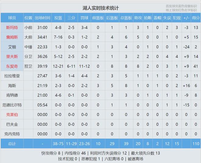 湖人遭遇3连败,34胜24负暂列西部第6,太阳34胜26负西部第7,两队仅剩1个胜场差。过去两场,太阳场均79分,今天打湖人狂轰113分。湖人后卫斯玛特赛后说:“作为竞争者,这样的比赛确实能给我们带来伤害。”最后看看数据: