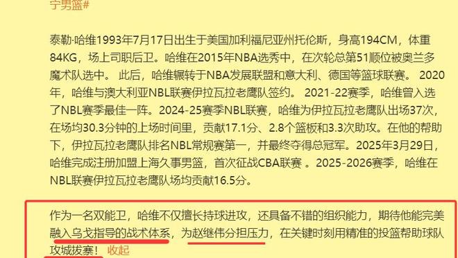 泰勒哈维如果能够完美融入接替杨鸣的洛佩斯主教练的战术,也能和队友之间优势互补、相得益彰,确实是能为赵继伟分担压力。
