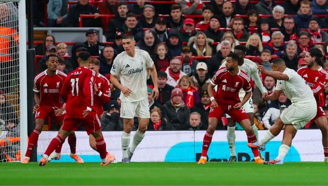 第33分钟,挨打了半小时的诺丁汉森林获得角球,穆里略的射门洞穿了阿利松的十指关,阿利松示意恩多耶在越位位置干扰门将,裁判认定进球有效。